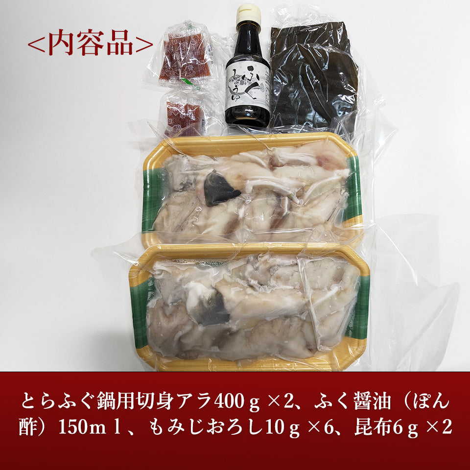 とらふぐ鍋用切身アラ400g×2、ふく醤油(ぽん酢)150ml、もみじおろし10g×6、昆布6g×2