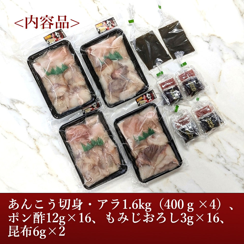 あんこう切身・アラ1.6kg(400g×4)、ポン酢12g×16、もみじおろし3g×16、昆布6g×2